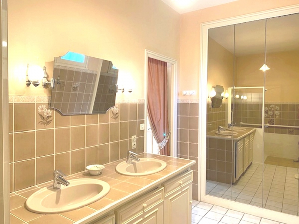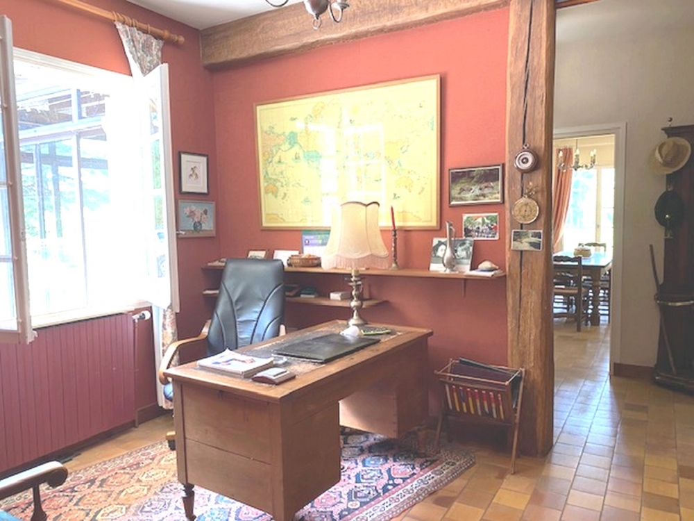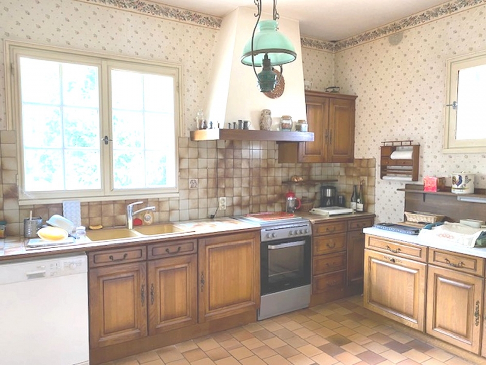 Rez-de-chaussée : véranda, entrée, beau séjour traversant et lumineux de 45 m² équipé d'un poêle à bois, cuisine aménagée, arrière-cuisine, bureau ou chambre, wc avec lave-mains, chambre, salle d'eau avec double vasques douche et penderie.
