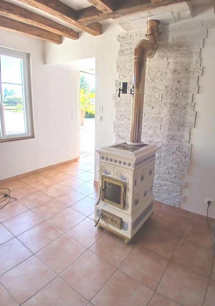 Maison équipée d'un chauffage avec pompe à chaleur Air/Eau et poêle à bois.