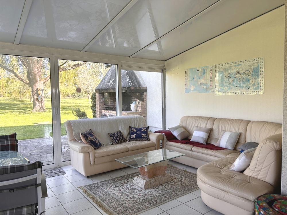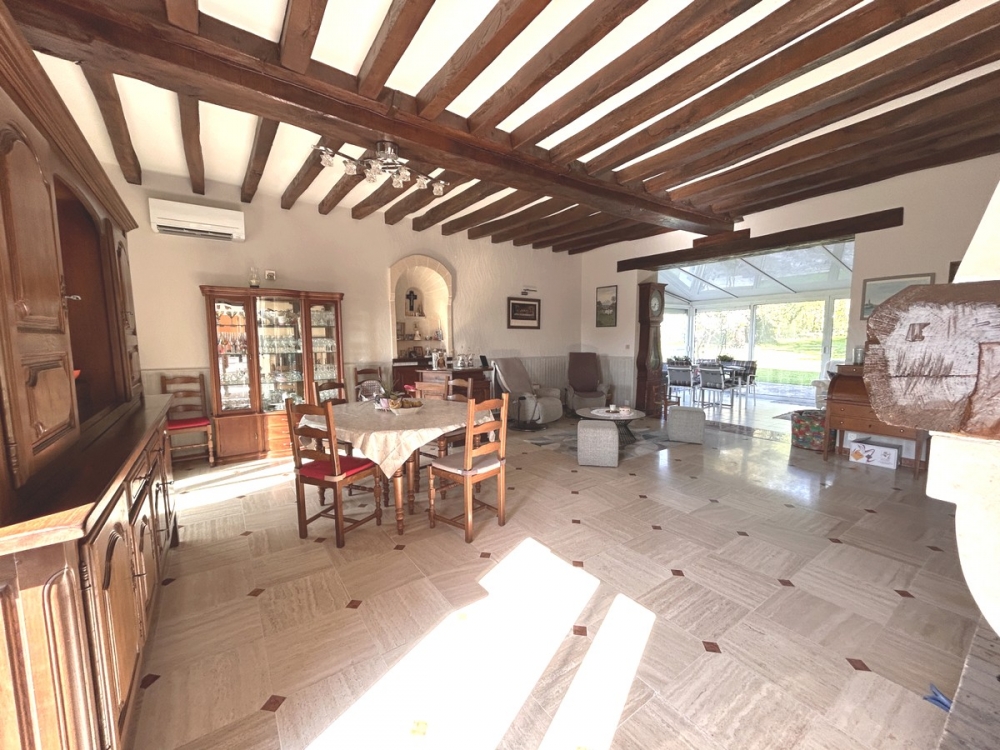 Rez-de-chaussée donnant sur une entrée, séjour de 41 m² avec cheminée/insert (poutres et travertin) ouvert sur véranda de 20 m² donnant sur le parc, autre véranda avec spa, cuisine A et E, wc avec lave mains.