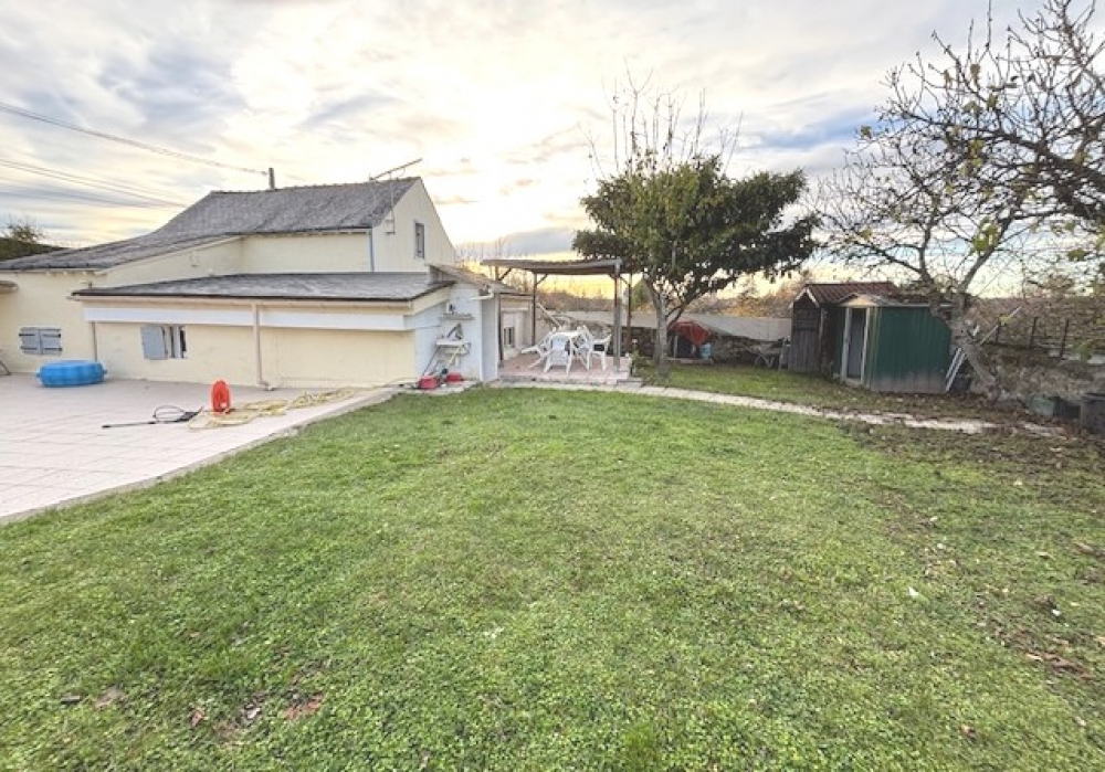 Terrain d'environ 200 m² avec deux terrasses et abris de jardin.