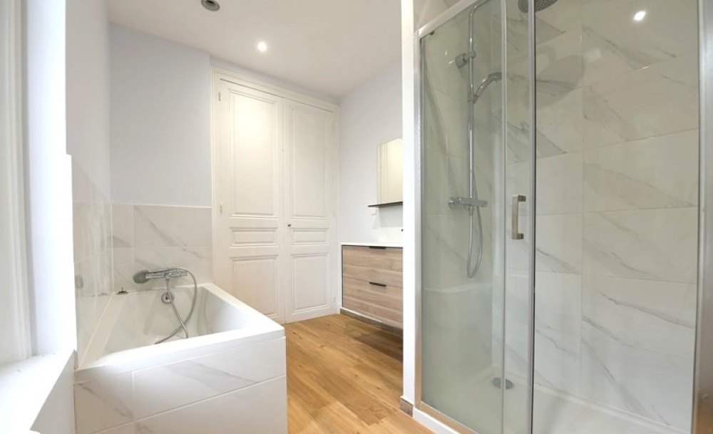 1er Etage : palier, 3 chambres, dont une avec douche/wc et balcon, salle de bains avec douche et baignoire, wc.