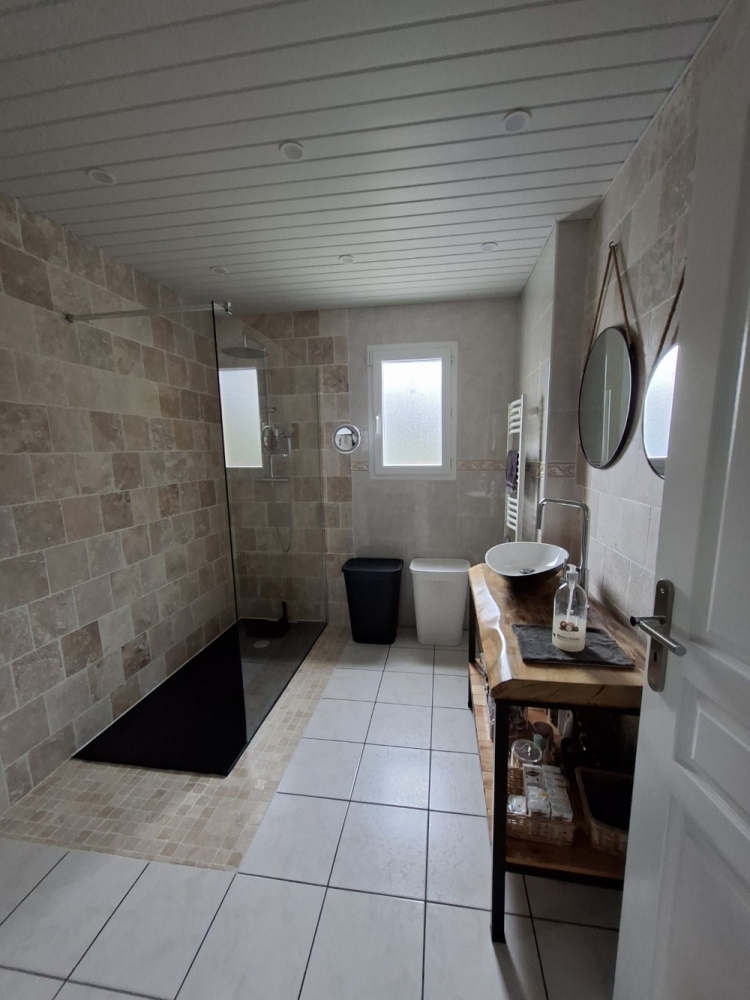À l'étage : Une grande mezzanine de 38 m² idéale en espace bureau, salle de jeux ou coin nuit, 2 chambres, une salle d'eau avec wc, climatisation réversible.