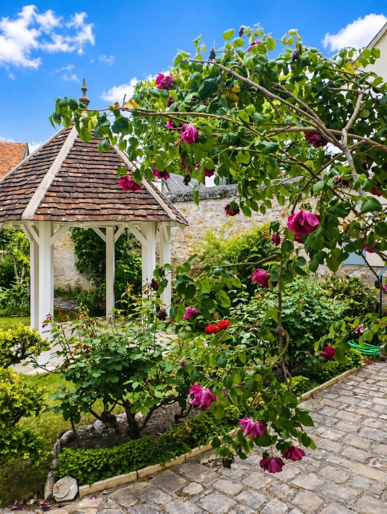 Cette maison de maître s'organise autour d'une cour pavée de 180m², un véritable havre de paix, agrémenté de massifs fleuris et pelouse et d'un élégant kiosque de 10 m² qui invite à la détente dans un cadre serein et préservé.